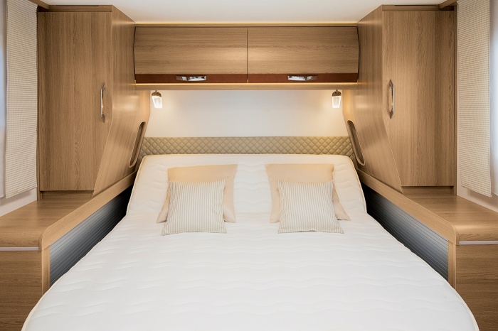 Per quanto riguarda la camera, tutte le ambientazioni con letto centrale sono ora provviste di un telaio retrattile (696F, 896F, 8096dF, i96, i190, M96). In questo modo si ottiene uno spazio di passaggio ai piedi del letto più ampio, per muoversi più agevolmente. A veicolo fermo potrete inoltre approfittare del comfort della testata del letto in posizione rialzata.