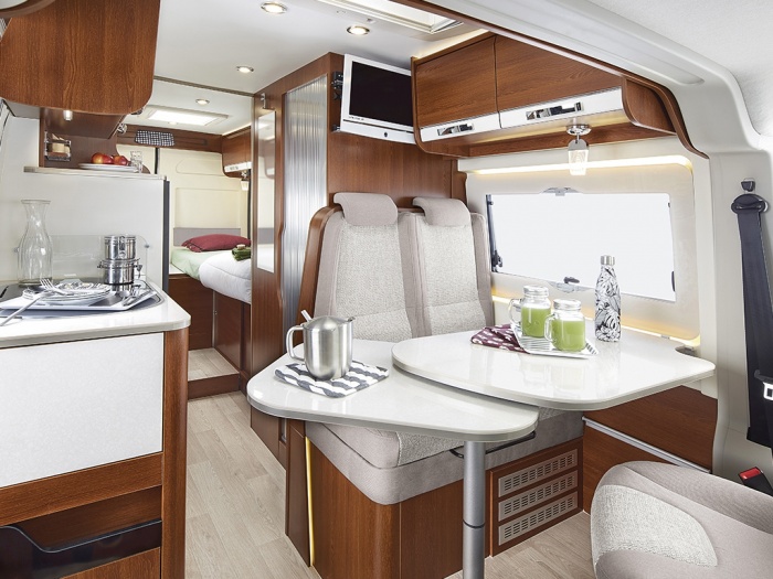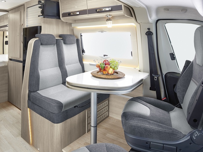All'esterno, un nuovo blocco intermediario della porta scorrevole laterale permette di aprire la porta a metà e di cucinare al riparo dal vento o dalla pioggia. Infine, le finestre laterali e posteriori ora sono dotate di un doppio vetro con cornice in poliuretano e provviste di tende e zanzariere integrate.