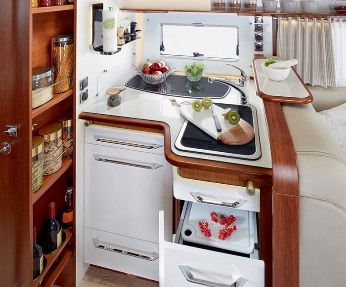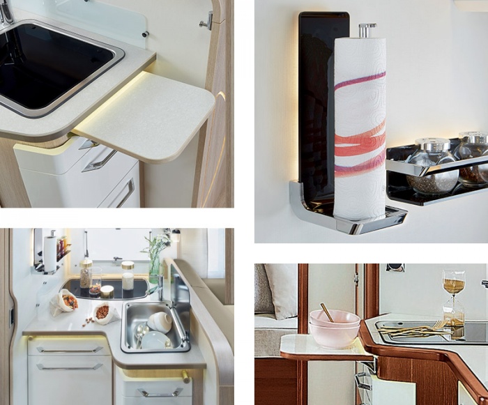 I blocchi cucina degli autocaravan RAPIDO sono stati ripensati con una superficie di lavoro aumentata e un nuovo design. Per una maggiore comodità, un'estensione del piano di lavoro lascia ancora più spazio ai cuochi.