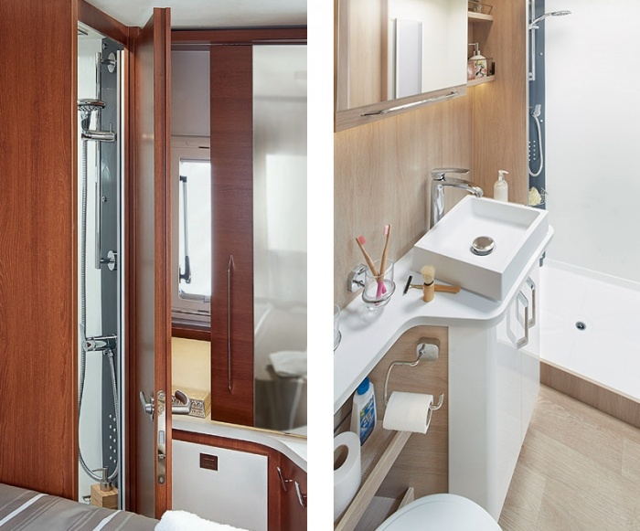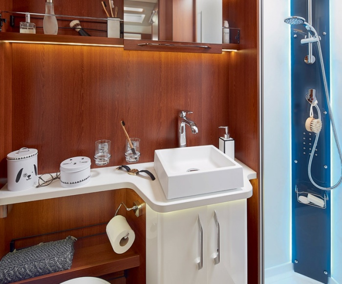 I nuovi bagni RAPIDO beneficiano di un nuovo rivestimento del piano lavabo design e di un nuovo lavabo rettangolare termoformato (in base al modello) con miscelatore in ottone e cartuccia in ceramica, che si sposeranno perfettamente con le nuove porte degli armadietti di colore bianco lucido.