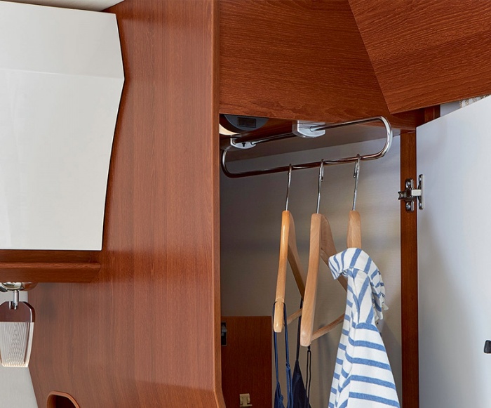 Le nuove camere degli autocaravan RAPIDO beneficiano di un nuovo design del guardaroba letto centrale (esclusi 650F e 850F). Questo guardaroba smussato offre una grande capacità di stivaggio. Ovviamente abbiamo mantenuto le nicchie portaoggetti laterali retroilluminate sulla testata.