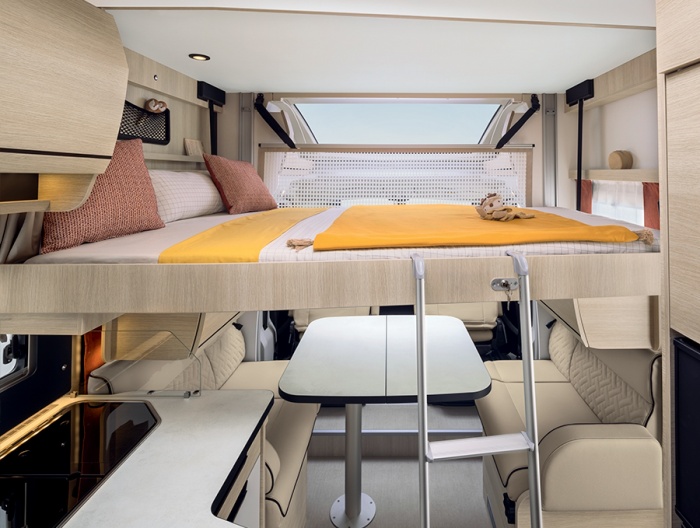 Volete configurare il modello della Serie 6F in base alle vostre esigenze? Disponibile in opzione, potete optare per un letto a soffitto elettrico 2 piazze. Quest'ultimo è presente di serie sul modello 606F. In totale, avrete a disposizione 4 posti letto nel vostro veicolo.