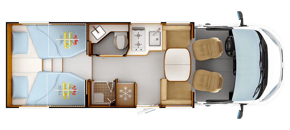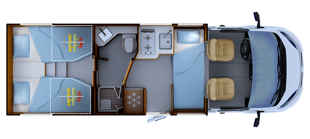 • Letti gemelli posteriori: 800 x 1950 + 800 x 1920 mm